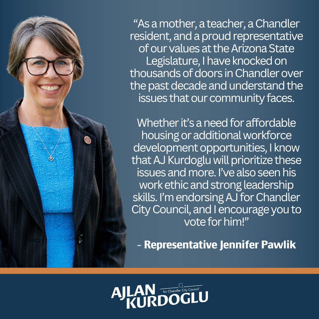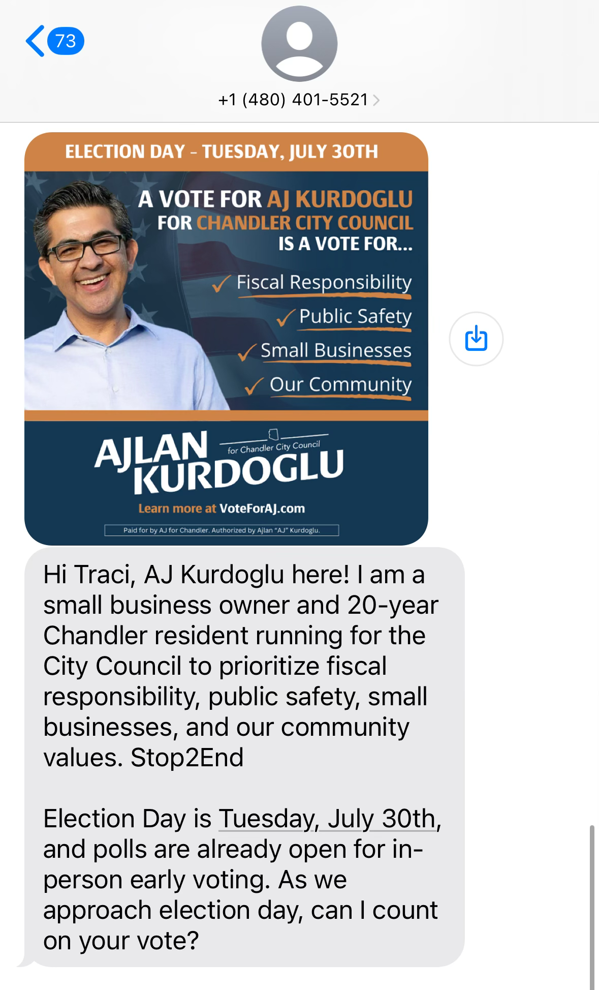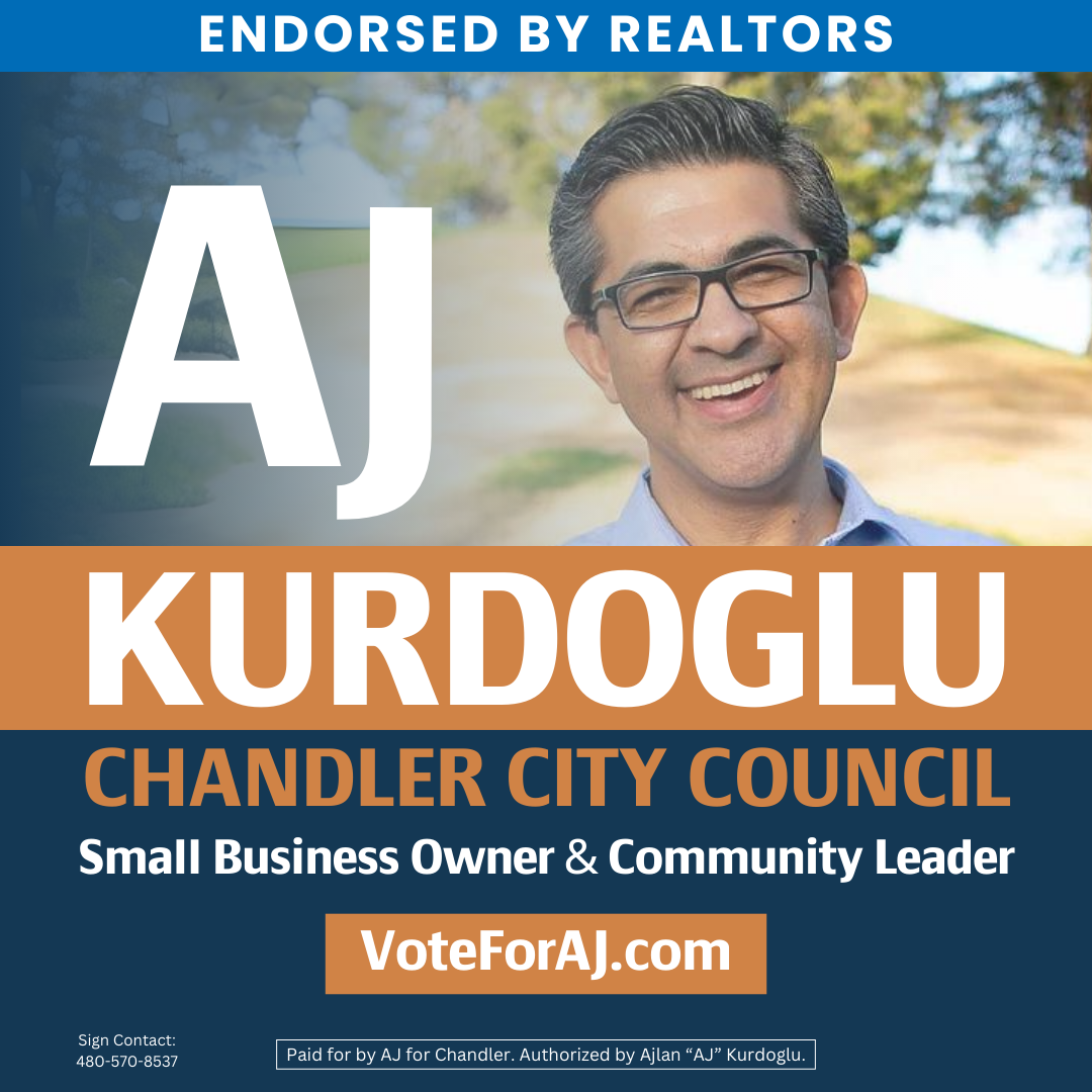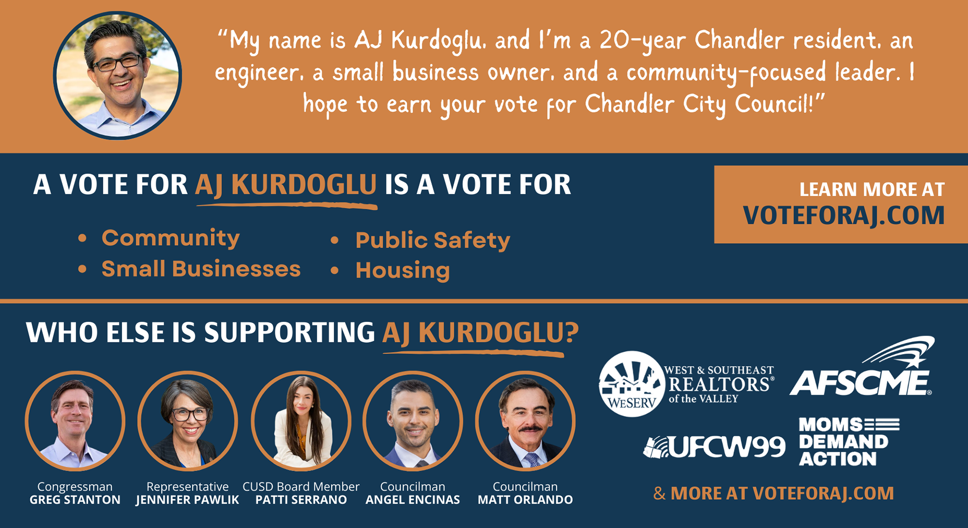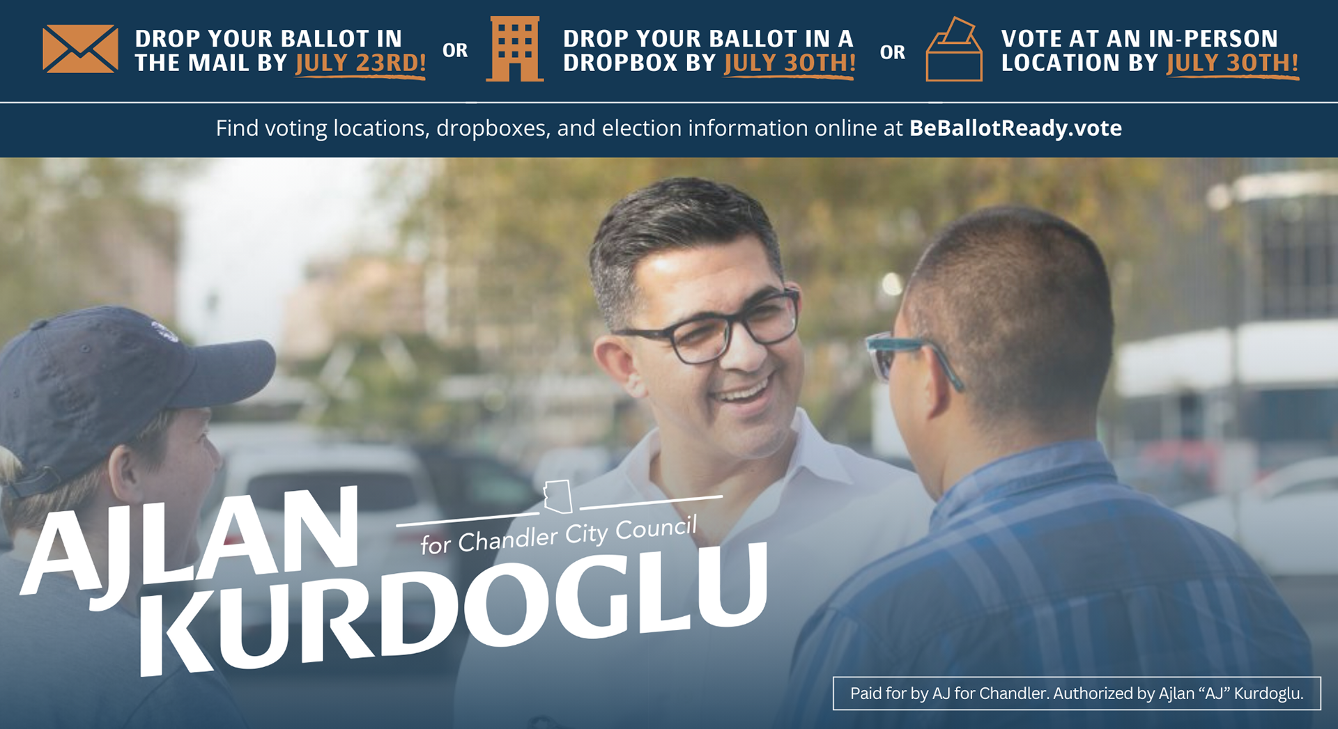 Ajlan "AJ" Kurdoglu stepped up as the only registered Democrat to run in the nonpartisan Chandler City Council race in 2024, a challenge that needed a battle-tested candidate. I stepped in during GOTV to produce and target campaign mailers, design literature, write copy for and send text messages, develop social media content, create and launch digital ads (on Facebook and Instagram), and design and order yard and street signs.
